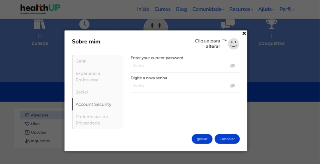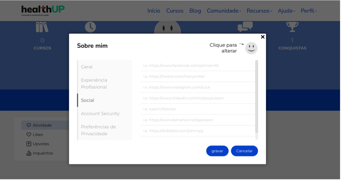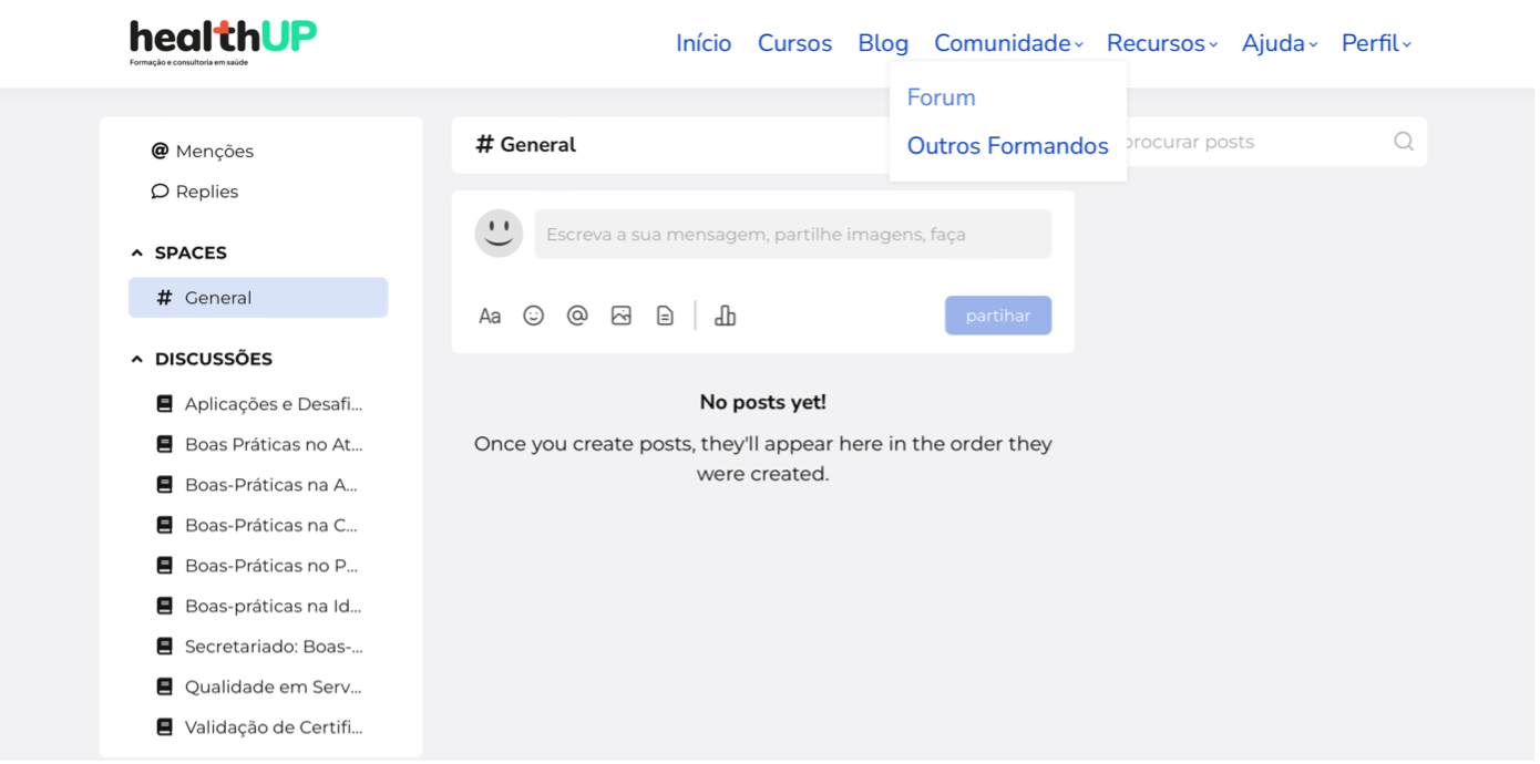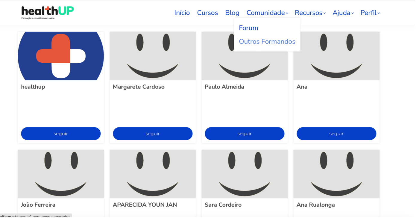 - Comunidade – menu de acesso à Comunidade Health UP e às funcionalidades sociais da Plataforma: